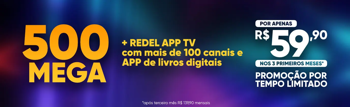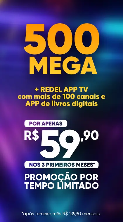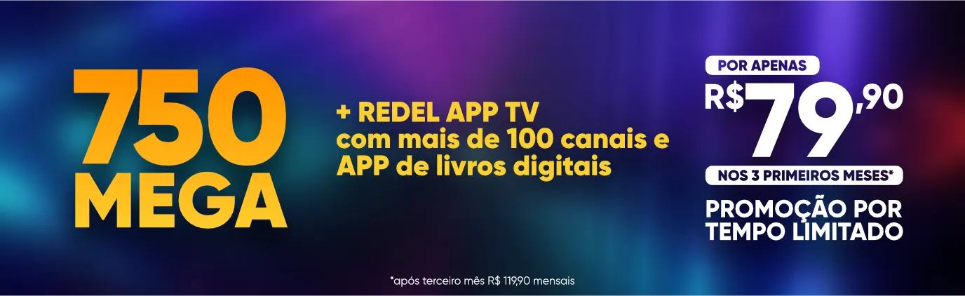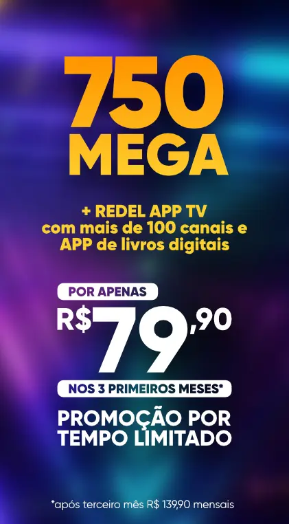 Nos planos 300 mega, 500 mega, 750 mega e 1000 mega está incluso o pacote REDEL APP TV LIFE LINE com mais de 70 canais, abertos e fechados. Consulte ainda nossos PACOTES EXTRAS com até 140 canais.